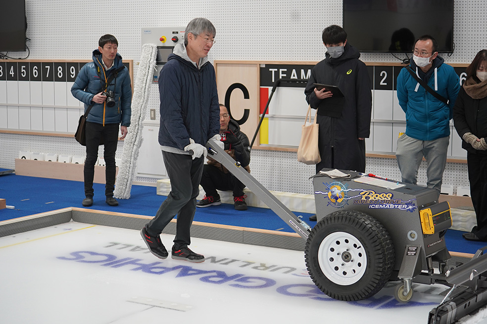 冬季スポーツ科学研究推進センターでは、カーリングブラシで氷を擦る「スイーピング」について研究しています。