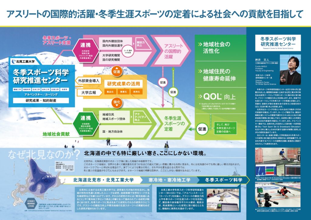 冬季スポーツ科学研究推進センターは、地域と密着し工学的視点から冬季スポーツの研究に取り組む世界的に前例のない研究組織です。積雪寒冷地域に立地する北見工業大学の特色ある研究テーマとして冬季スポーツに集中的に取り組み、アスリートの競技力向上を目指します。